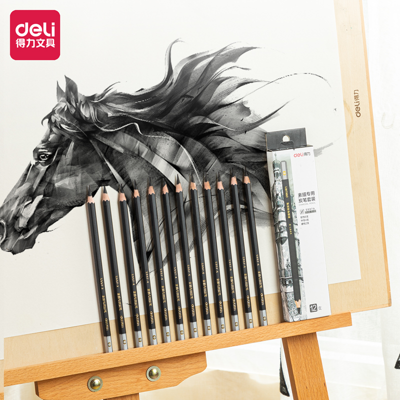 得力(deli)素描炭笔 初学者速写碳笔软中硬 绘画美术生专用工具 12支/盒混装 S997A