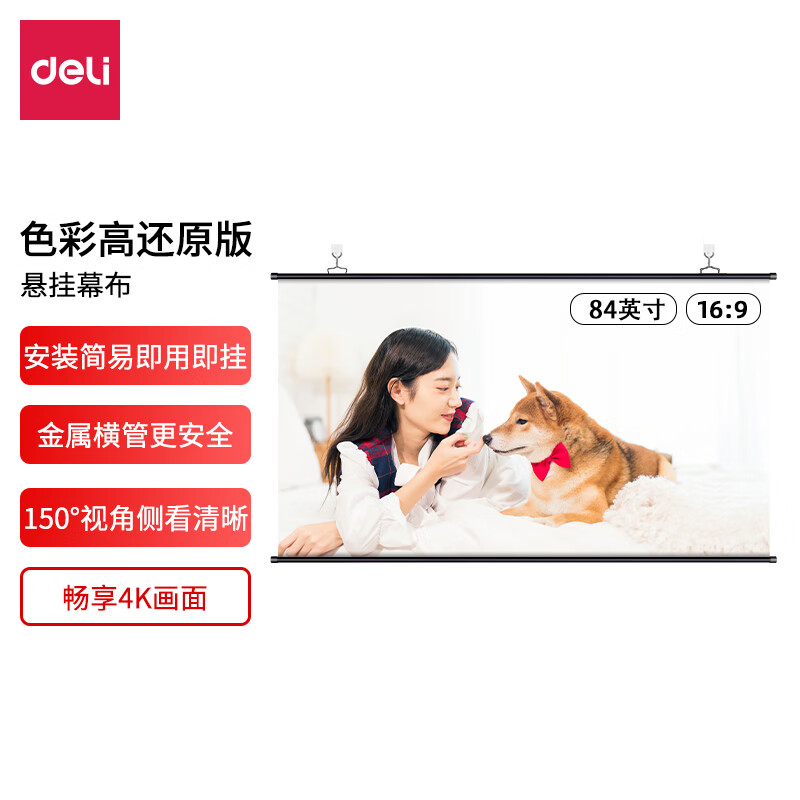 得力(deli) 84英寸16:9白塑挂壁悬挂式简易便携投影机投影仪幕布 家用投影幕布 商务办公会议