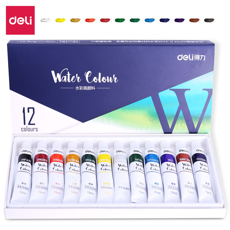 得力(deli)水彩颜料 12色12ml 大容量画画美术专用 便携专业级学生儿童绘画套装便携工具写生