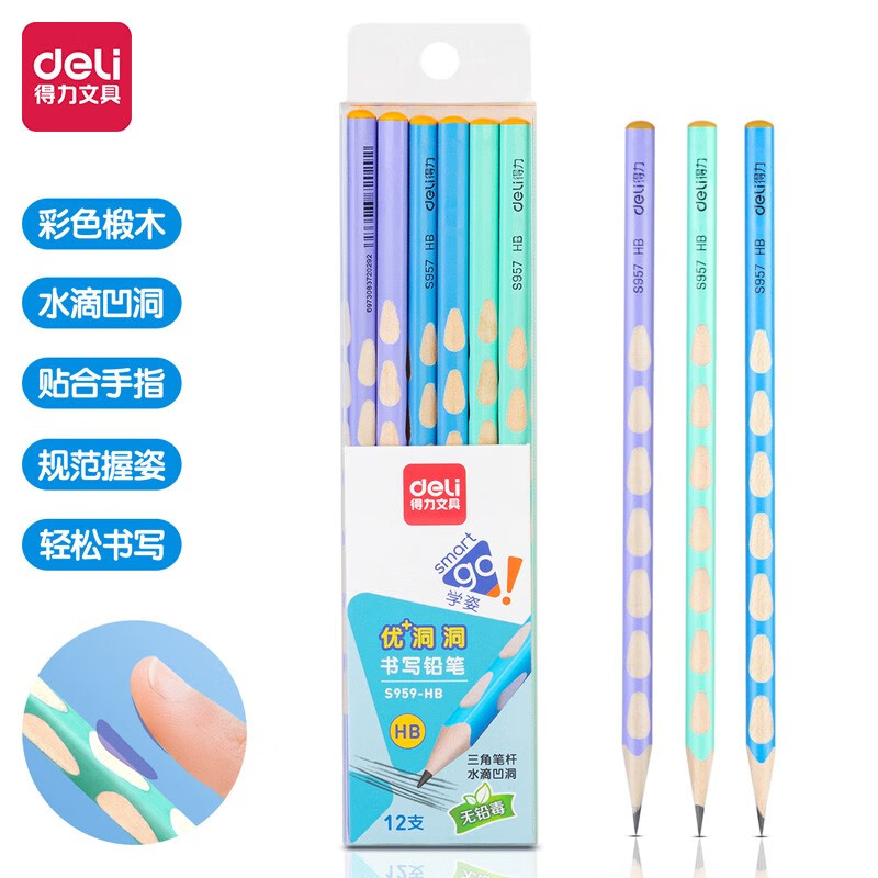 得力(deli)洞洞笔铅笔 12支HB马卡龙色三角杆书写铅笔 易抓握儿童矫姿铅笔 初学者学生练字笔