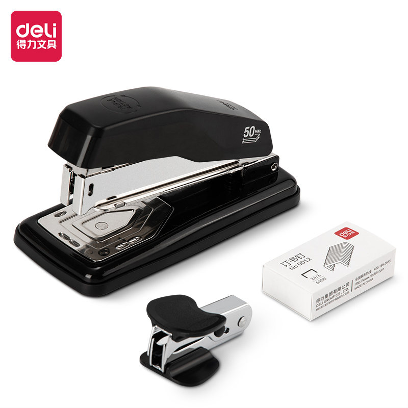 得力(deli)12#旋转订书机套装(起订器+订书钉+订书机)三合一办公用品 黑0418