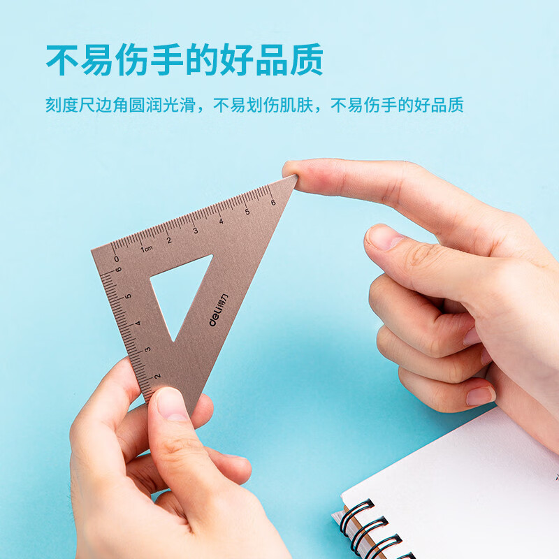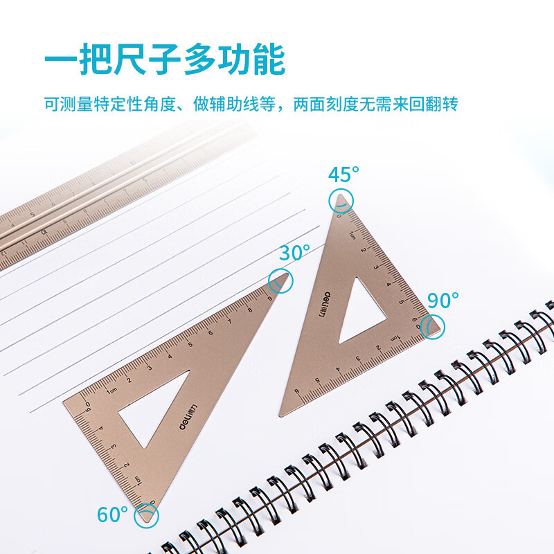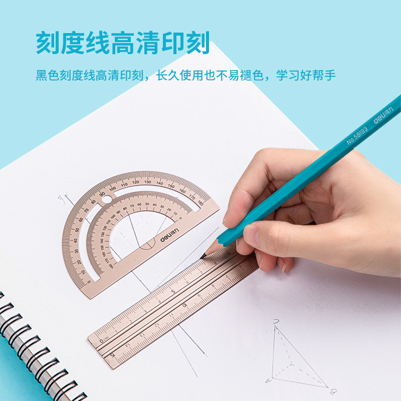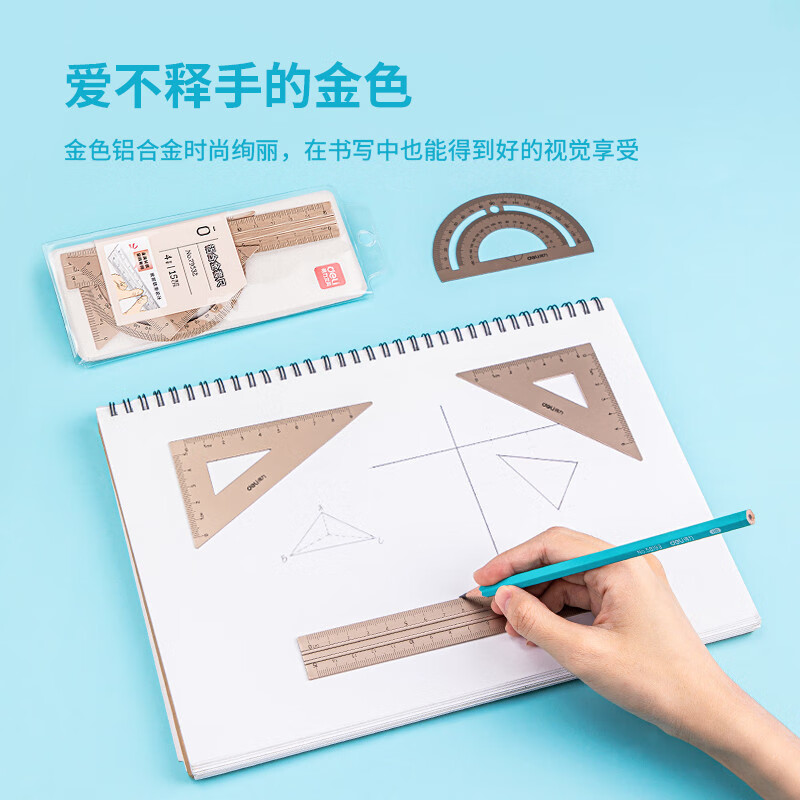 得力(deli)金属学生绘图考试套尺(直尺+三角尺*2+量角器)文具套装 古铜色79532