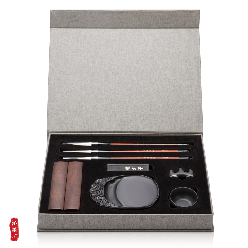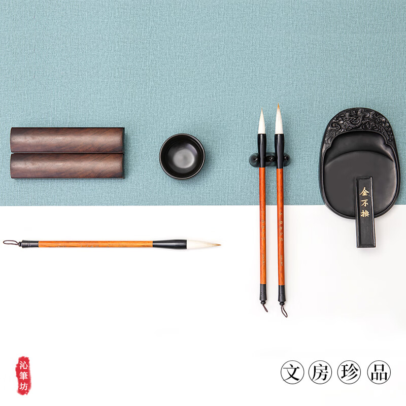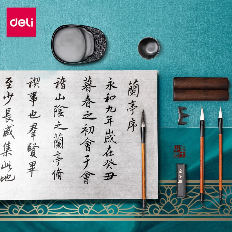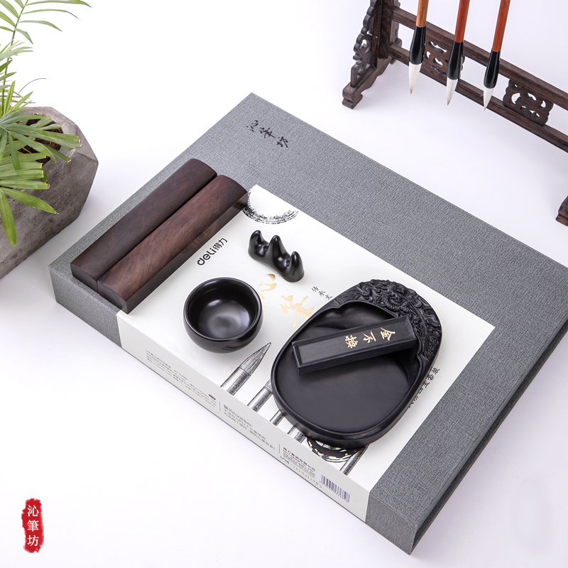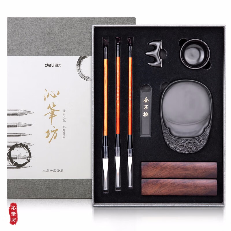 得力(deli)沁笔坊精品礼盒 文房四宝书法套装(毛笔/墨锭/砚/笔搁/水碗/镇尺)成人初学者入门笔
