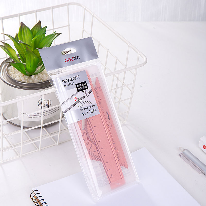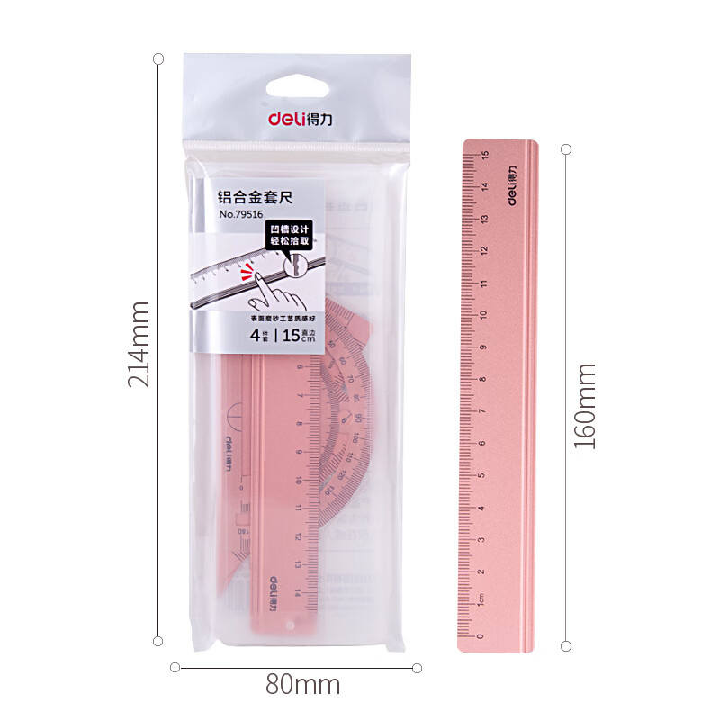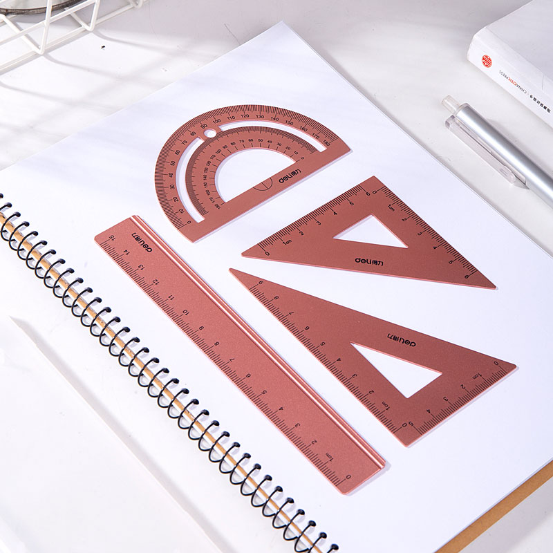得力(deli)金属磨砂学生绘图考试套尺(直尺+三角尺*2+量角器)4件套 粉色79516