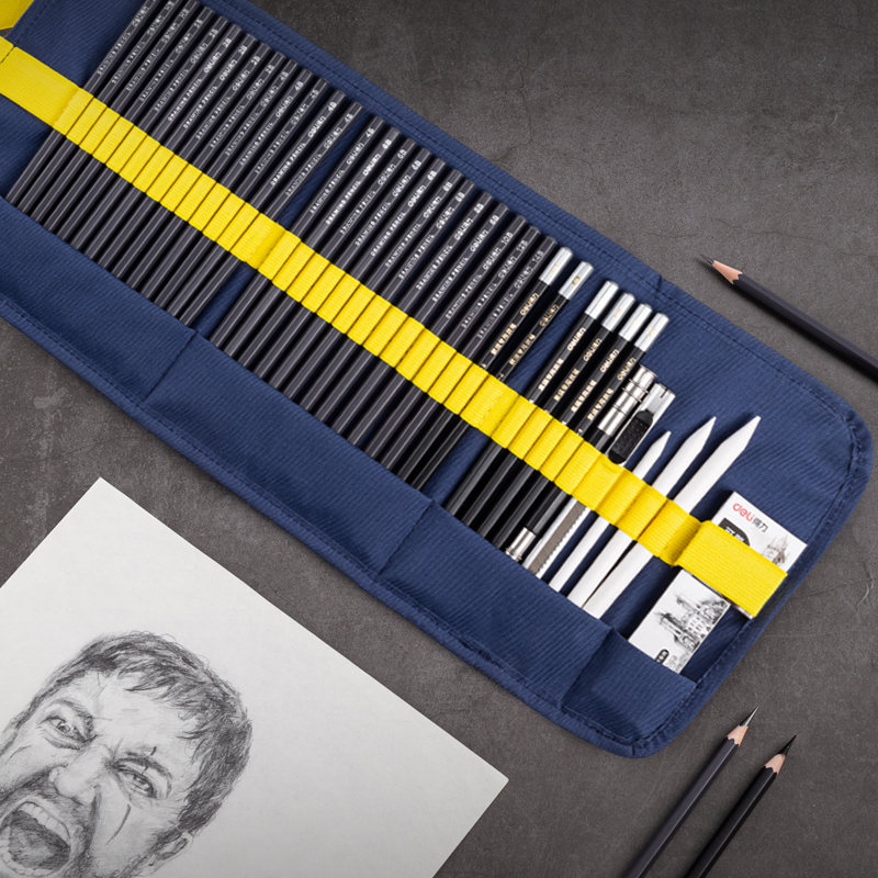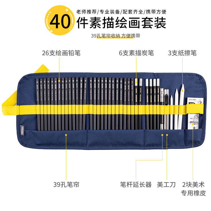 得力(deli)专业素描铅笔40件套 铅笔+炭笔+橡皮+美工刀+纸擦笔+笔杆延长器+笔帘专业美术绘图