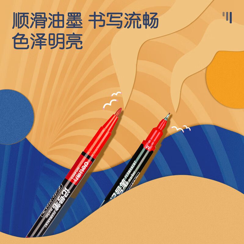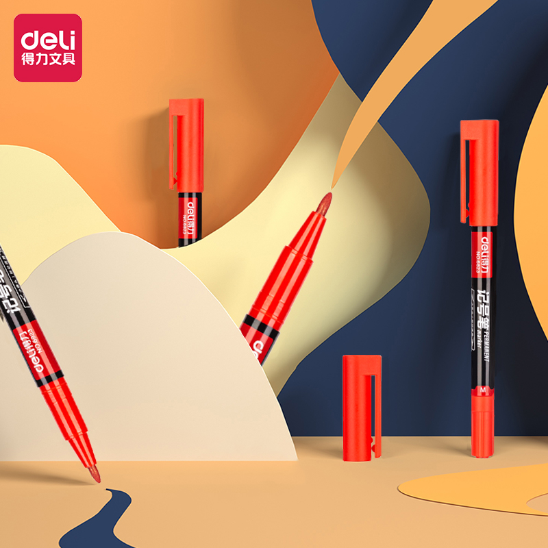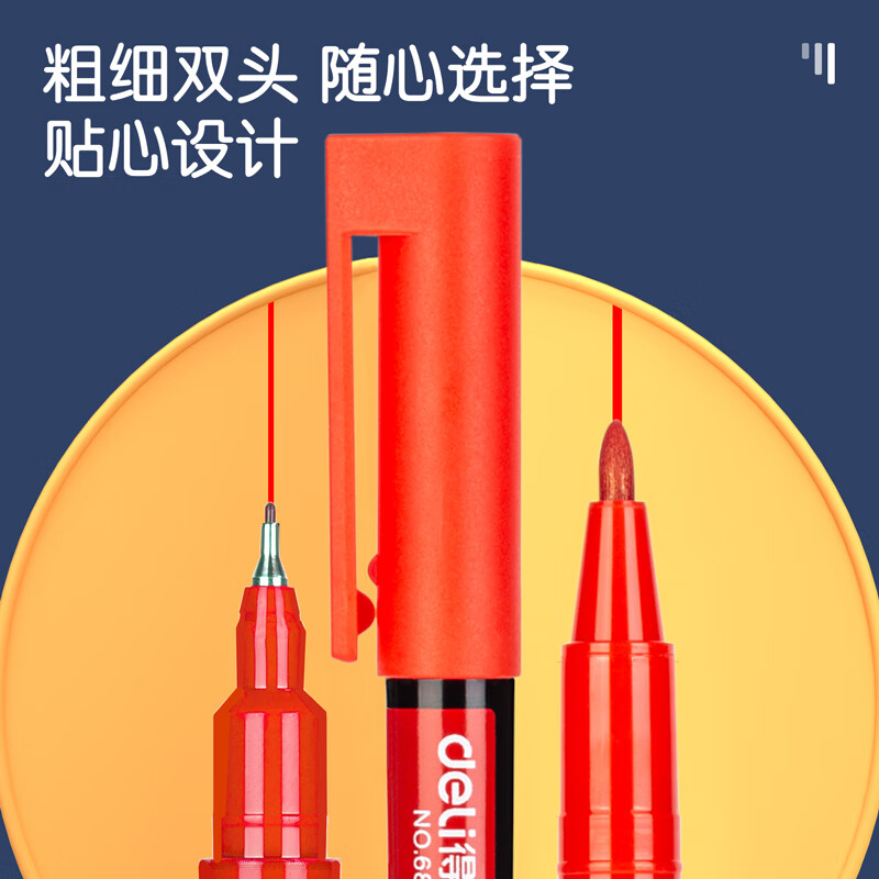 得力(deli) 小双头多用记号笔签字笔 勾线笔会议笔马克笔 12支/盒 红色 6823