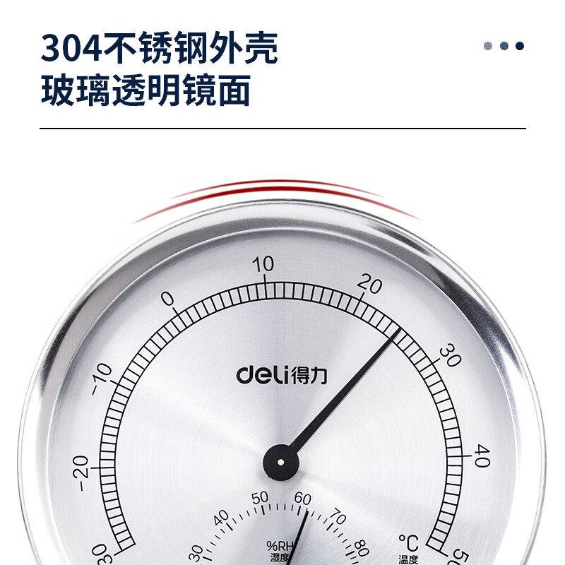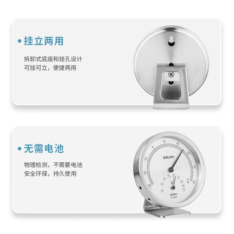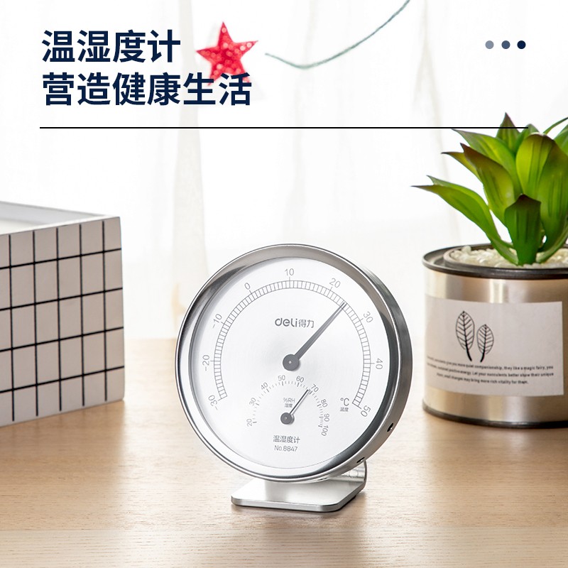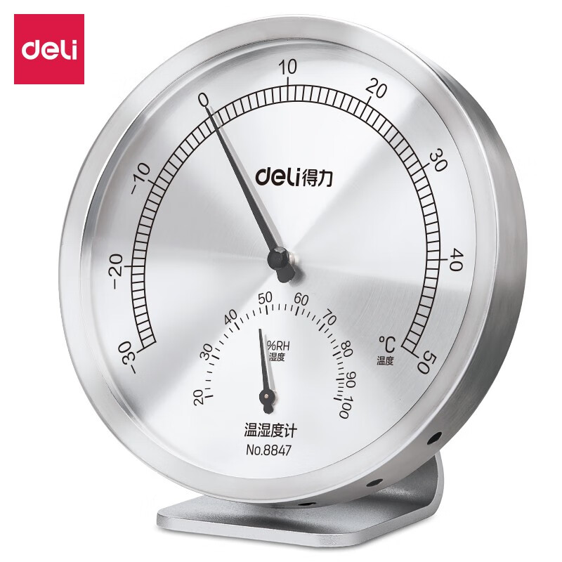 得力(deli)家用金属室内温湿度计 挂立两用免电池大表盘办公家用室内外测温计 8847